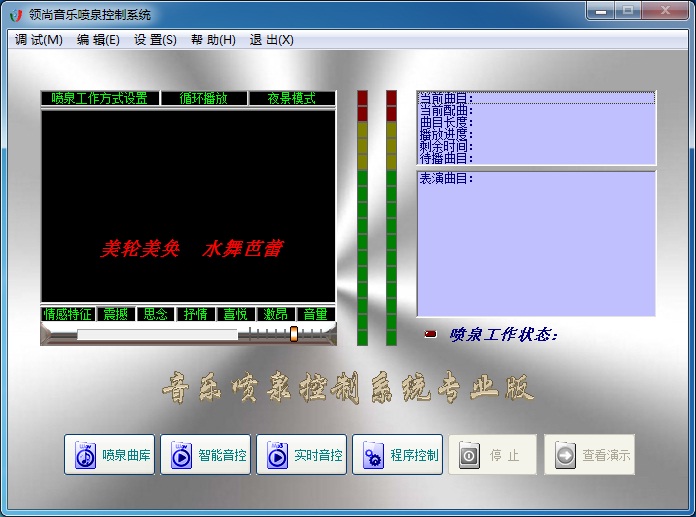 MFTPRO是一款全新的工业以太网分布式架构的大型音乐喷泉专业控制软件,是基于情感特征识别,集合智能音乐控制、可编程序控制、手动控制技术为一体的音乐喷泉控制系统。在本系统中,智能音控模式选择WAV文件作为播放音源,全自动实时音控模式可选择任意格式音频文件、光驱、麦克、CD机或现场K歌、DJ表演等音频设备的线路输出作为播放音源,软件利用音乐文件的物理波形,将其分为若干乐段,精度达十毫秒,并且自动识别震撼、思念、抒情、喜悦、激昂、悲哀、欢快、热烈等乐曲的基本情感特征,转换为控制信号,经过同步处理后通过信号输出卡输出到外围具体控制单元,即根据水型组态规则控制潜水泵、电磁阀、水下彩灯和变频器等执行机构,将视觉感受与听觉感受融为一体。